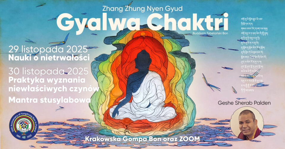W dniach 29-30 listopada będziemy gościć w progach naszej krakowskiej gompy Geshe Sheraba Paldena. W czasie swej wizyty, nasz czcigodny Gość odniesie się do dwóch części praktyk wstępnych, na temat których w sierpniu tego roku podczas retreatu w Chamma Ling w Wildze nauki wygłosił Tenzin Wangyal Rinpoche. Ujęte w zbiorze Gyalwa Chaktri, nauki te pochodzą z cyklu Zhang Zhung Nyen Gyud – Ustnego Przekazu Zhang Zhung. Pierwszego dnia skupimy się na wyjaśnieniach na temat nietrwałości, by pod przewodnictwem Geshe skupić się na kontemplacji tego aspektu naszej egzystencji w samsarze. W chwili refleksji przyjrzymy się swemu przywiązaniu do iluzji trwałości zjawisk codziennego życia. Drugi dzień Geshe rozpocznie wyjaśnieniami dotyczącymi praktyki wyznania skalań. Przedstawi nam sposoby korzystania z tzw. czterech mocy – świadka, wyznania, żalu i antidotum oraz omówi niewłaściwe czyny ciała, mowy i umysłu. Następnie przejdziemy do praktyki z użyciem Mantry Stusylabowej. Nasz Gość objaśni nam znaczenie tej mantry oraz szczegóły wizualizacji towarzyszącej jej recytacji. Zapraszamy serdecznie wszystkich praktykujących i wszystkich, którzy jeszcze z praktyka się nie zetknęli, lecz chcą zapoznać się ze starożytną mądrością Tybetu i tradycji Yungdrung Bön. Nauki odbywać się będą stacjonarnie w naszej krakowskiej gompie przy ul. Stradomskiej 17/4 oraz w przestrzeni wirtualnej na platformie Zoom.