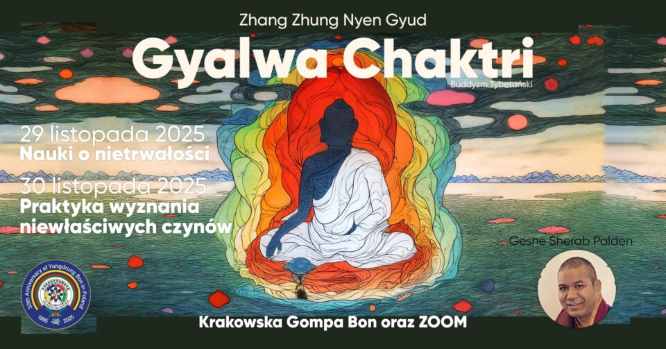 W dniach 29-30 listopada będziemy gościć w progach naszej krakowskiej gompy Geshe Sheraba Paldena. W czasie swej wizyty, nasz czcigodny Gość odniesie się do dwóch części praktyk wstępnych, na temat których w sierpniu tego roku podczas retreatu w Chamma Ling w Wildze nauki wygłosił Tenzin Wangyal Rinpoche. Ujęte w zbiorze Gyalwa Chaktri, nauki te pochodzą z cyklu Zhang Zhung Nyen Gyud – Ustnego Przekazu Zhang Zhung. Pierwszego dnia skupimy się na wyjaśnieniach na temat nietrwałości, by pod przewodnictwem Geshe skupić się na kontemplacji tego aspektu naszej egzystencji w samsarze. W chwili refleksji przyjrzymy się swemu przywiązaniu do iluzji trwałości zjawisk codziennego życia. Drugi dzień Geshe rozpocznie wyjaśnieniami dotyczącymi praktyki wyznania skalań. Przedstawi nam sposoby korzystania z tzw. czterech mocy – świadka, wyznania, żalu i antidotum oraz omówi niewłaściwe czyny ciała, mowy i umysłu. Następnie przejdziemy do praktyki z użyciem Mantry Stusylabowej. Nasz Gość objaśni nam znaczenie tej mantry oraz szczegóły wizualizacji towarzyszącej jej recytacji. Zapraszamy serdecznie wszystkich praktykujących i wszystkich, którzy jeszcze z praktyka się nie zetknęli, lecz chcą zapoznać się ze starożytną mądrością Tybetu i tradycji Yungdrung Bön. Nauki odbywać się będą stacjonarnie w naszej krakowskiej gompie przy ul. Stradomskiej 17/4 oraz w przestrzeni wirtualnej na platformie Zoom.